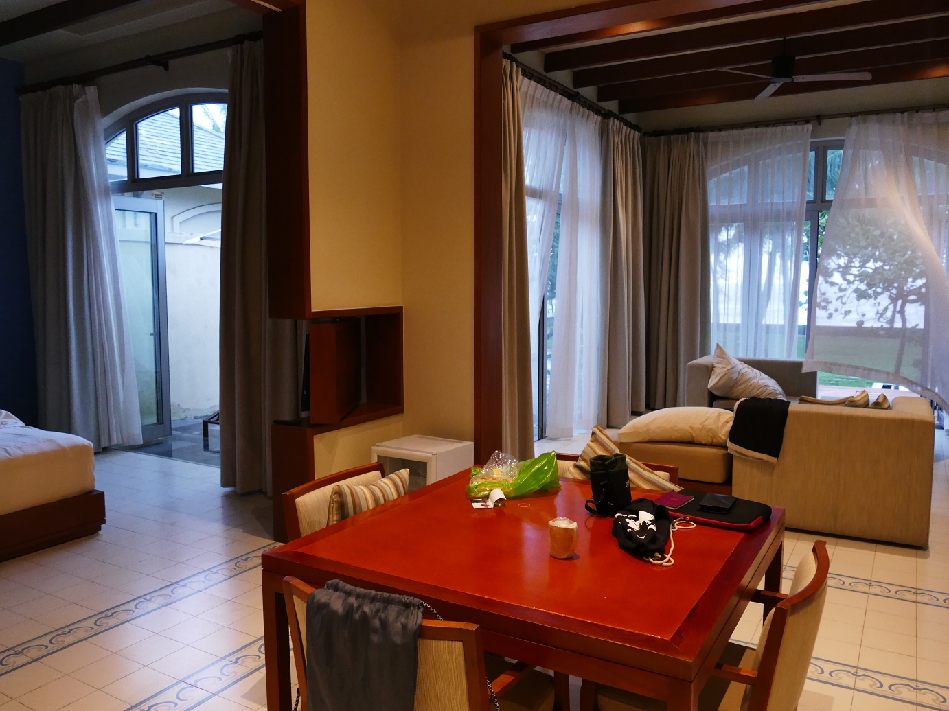 Je näher wir dem Ressort kamen, desto dunkler wurde es. Ganze Straßenzüge, wo kein Licht in den Häusern brannte. Das Haupthaus war ein riesiges Hotelgebäude, aber selbst dort brannten nur ein paar Lichter. Man nahm uns freundlich in Empfang und fuhr uns mit einem kleinen Buggy durch die Dunkelheit zu unserem Poolhaus. Es war ein merkwürdiges Gefühl, fast wie ein sehr gut erhaltener Lost Place.